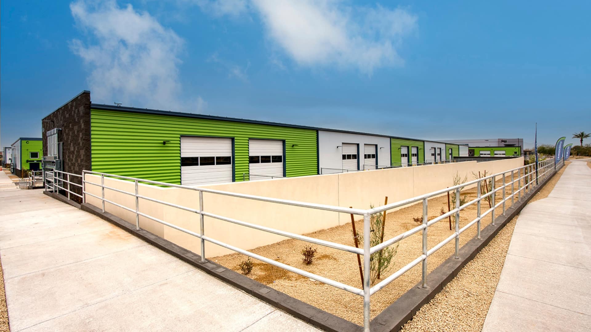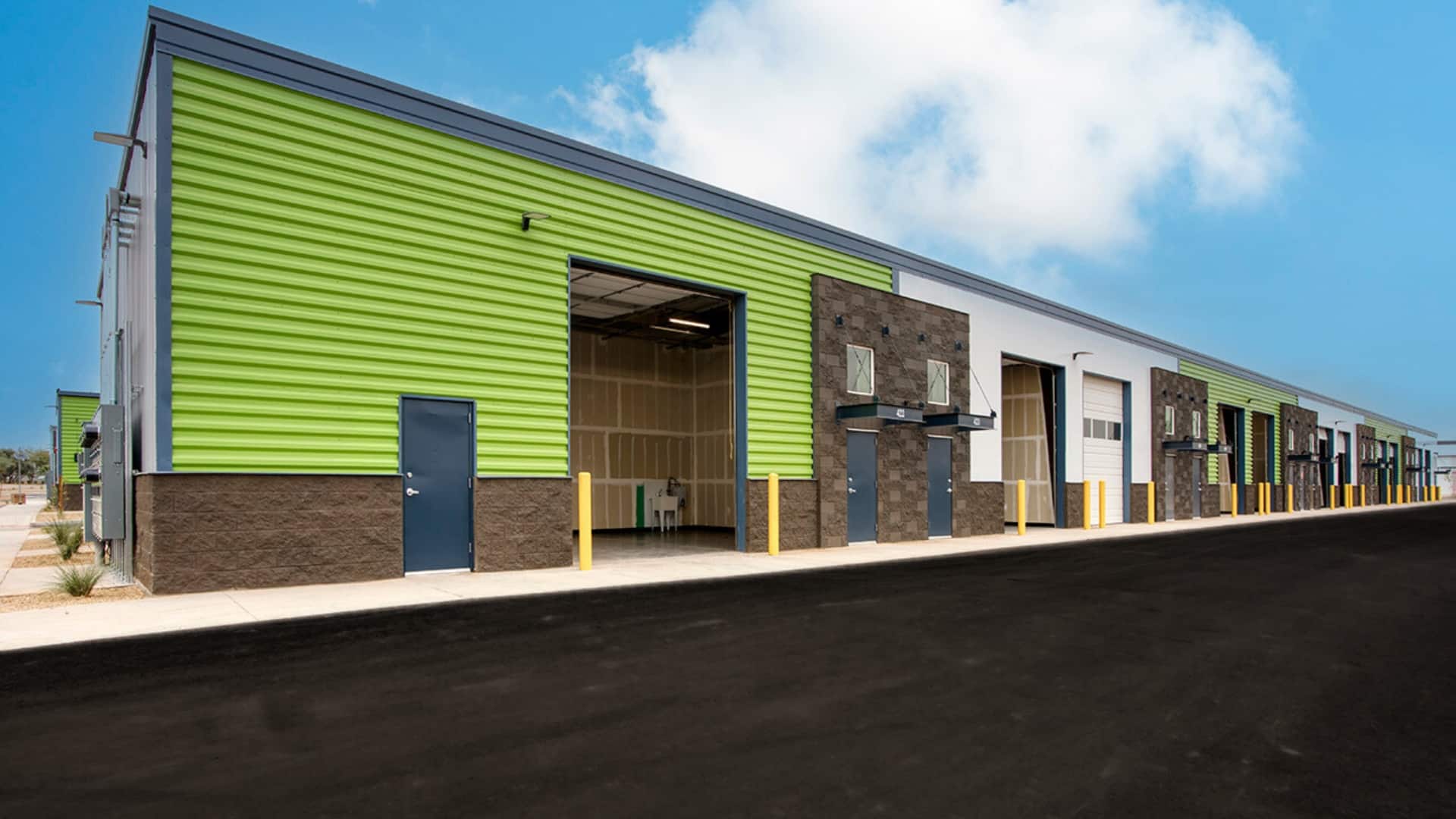 Office/industrial project with five buildings totaling 80,062 square feet. The design-build, ground-up construction offers private, flexible small warehouse and office spaces for rent. Workspaces range from 500 to 3,000 square feet, featuring roll-up bay doors and high ceilings ranging from 14 to 26 feet.